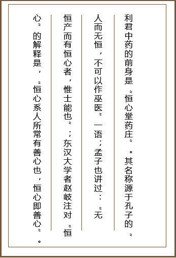 • 利君中藥具有近400年的悠久歷史。公司前身“恒心堂藥莊”始創(chuàng)于明朝末期,興盛于清代、民國,其招牌產(chǎn)品“坎壢妙濟 丹”、“參茸固本還少丹”功能獨特、療效神奇,享譽廣大西部地區(qū),有“神農(nóng)妙濟”之美譽,歷代名人左宗棠、于佑任、 屈武等都留有書聯(lián)贊譽。民國時期,“恒心堂”在西北5省及山西、四川、云南均設(shè)有分號,坐大西部藥界,同北京“同仁 堂”、浙江“胡慶余堂”、廣州“陳李記”一起,被稱為“四大藥莊”,是國內(nèi)為數(shù)不多的幾家具有數(shù)百年歷史的中藥“老 字號”之一。